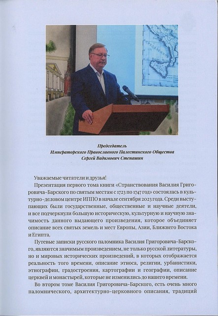 Как известно, уставной деятельностью Общества, в том числе, является паломничество в России и за рубежом. Знаменитая книга Василия Григоровича-Барского дает полное понимание пути паломничества по Африке, Ближнему Востоку, Азии и греческим островам. В ближайшее время в Императорском Православном Палестинском Обществе состоится презентация второго тома «Странствования Василия Григоровича-Барского по святым местам с 1723 по 1747 год».