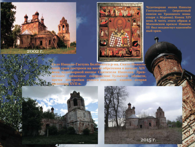 История самой древней тульской Никольской церкви связана с историей Московского Кремля. Это Николо-Гастунский храм недалеко от г. Белёва Тульской области. Именно в этом храме хранился обретённый там чудотворный образ святителя Николая. Икона была настолько почитаема на Руси, что на территории Московского Кремля в 1506 была выстроена каменная церковь Николая Чудотворца Гастунского. В этот храм Великий князь Василий III перенёс икону Николы-Чудотворца, которая была привезена его отцом Иоанном III из Гастуни в 1503 г. Гастунская церковь Московского Кремля была известна и тем, что именно в ней служил дьяконом первопечатник Иван Фёдоров. К сожалению, храм в Кремле был снесён в 1817 г. В Тульской же области Николо-Гастунский храм сохранился, и в настоящее время в нём начались восстановительные работы.