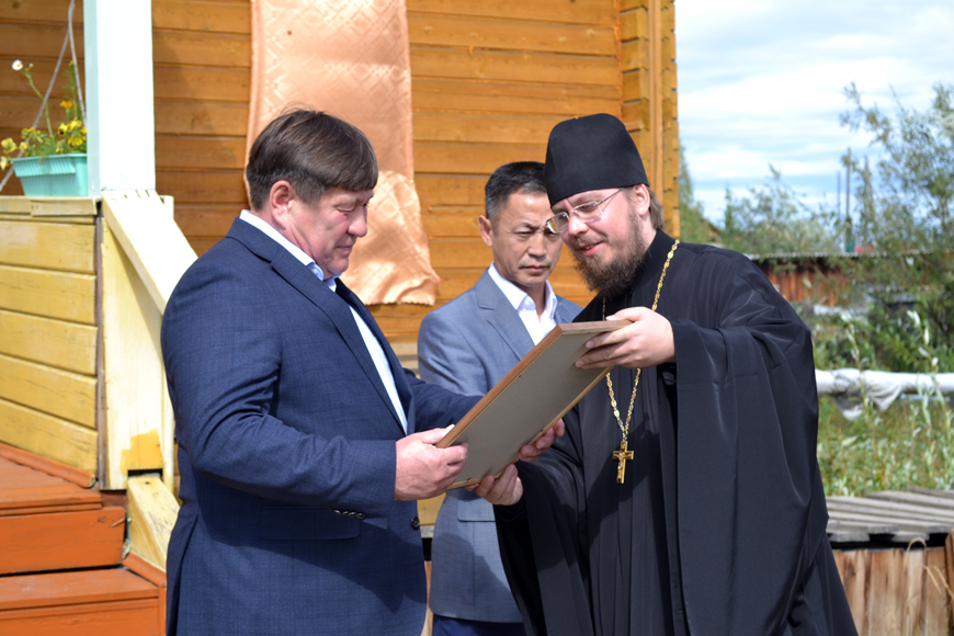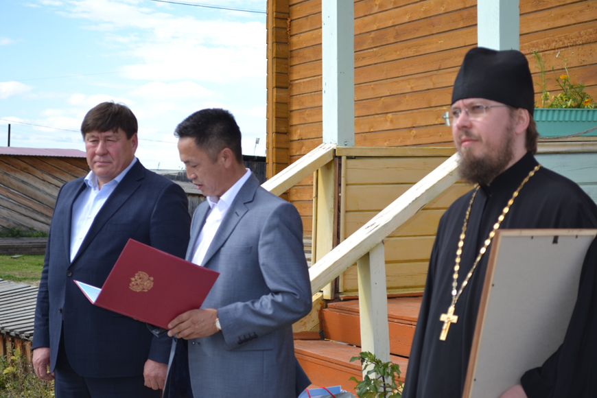 Отец Никон вручил Сергею Александровичу Ларионову Архиерейскую грамоту с благодарностью за огромную проделанную работу. Глава Усть-Майского района Юрий Боярский поблагодарил земляков за активность, за желание видеть на Усть-Майской земле храм и объявил, что на месте строительства уже проведены изыскания – все знают, что строить здесь сложно, почвы зыбкие и место выбрать непросто.