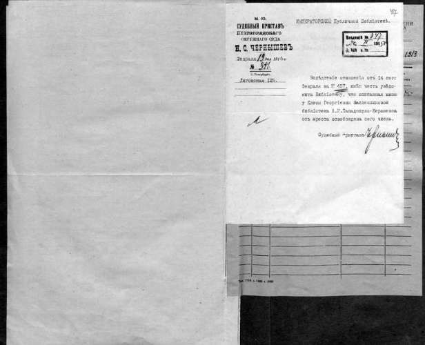Так было спасено наследие ученого византолога, которое по Повестке № 2511 судебного пристава Санкт-Петербургского окружного суда Н.С. Чернышова было арестовано 23 октября 1914 года за долги, а семья ученого, согласно этому документу, выселялась по адресу ул.Поварской переулок, дом 12 (фото 22).