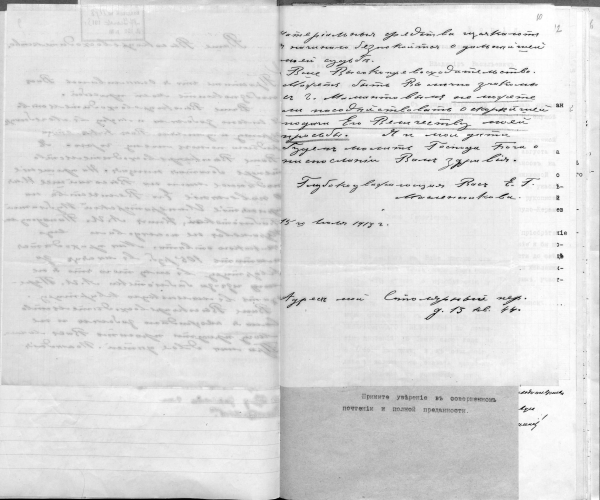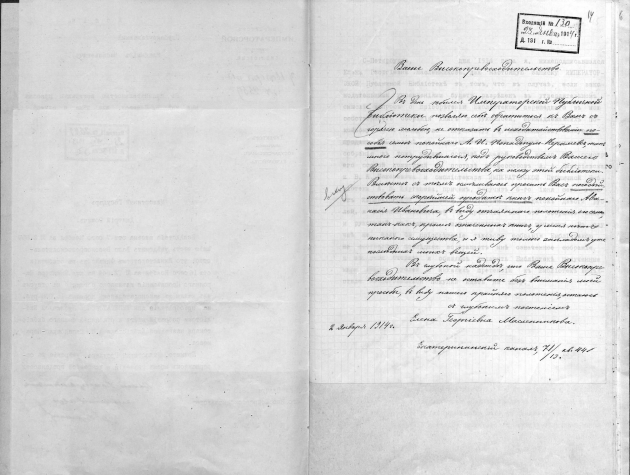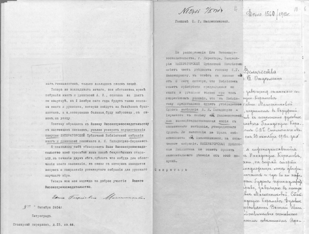 Процедура вынесения положительного решения о приобретении собрания А.И. для ИПБ началась в июне 1913 года. Побудительным моментом к этому послужили неоднократные обращения вдовы покойного в Канцелярию Его Императорского Ввеличества и непосредственно к директору ИПБ. В этих прошениях, написанных ее рукой и рукой, видимо, ее дочери-гимназистки, целая летопись жизни семьи покойного ученого за два с половиной года. Нельзя читать эти обращения-мольбы о помощи и содействии в деле спасения огромного бесценного наследия А.И. без сострадания и скорби (18-18а,19-19а, 20). Очень скоро после смерти мужа Е.Г. стала испытывать материальные затруднения. Содержание архива требовало сохранения его в прежних помещениях. Переехать в более скромную квартиру не было возможности без риска утраты части собрания. Два с половиной года семья живет, закладывая личное имущество. И вот по прошествии двух лет после смерти мужа Е.Г. в полном отчаянии пишет очередное прошение (от 8 октября 1914 года), в котором говорит о своем бедственном положении, о том, что продавать больше нечего, о том, что она «в течение двух последних лет существовала с сыном покойного, гимназистом, только закладом своих вещей» и далее: «Теперь же закладывать нечего. Вся обстановка, кроме собрания книг и рукописей и А.И., описана за долги по квартире, к 1 ноября сего года будут также описаны книги и рукописи, которые пойдут за бесценок букинистам. Я позволила себе побеспокоить Ваше Высокопревосходительство моей просьбой лишь после безуспешных стараний в течение двух лет сделать что-нибудь для облегчения моего положения, в связи с которым находится вопрос о сохранении упомянутого собрания для русского научного мира». (фото-18-18а).