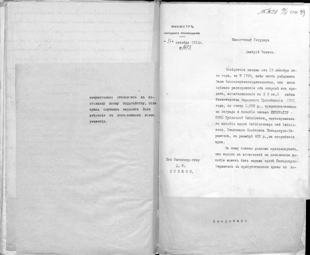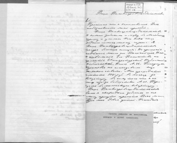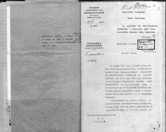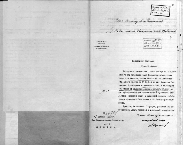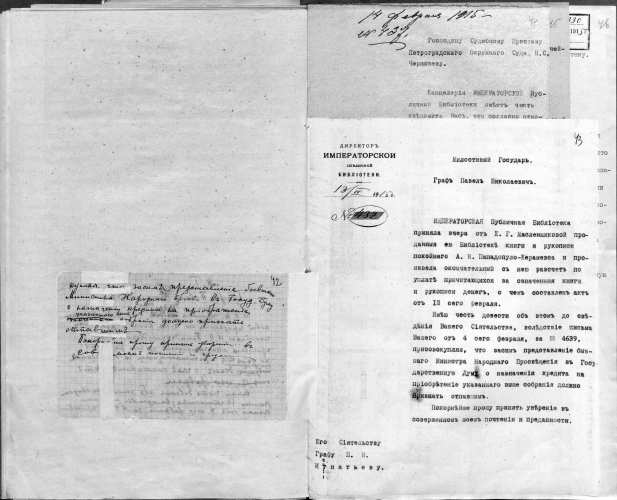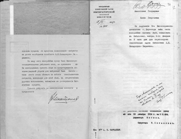Почему на два с лишним года затянулась процедура принятия, казалось бы, простого и очевидного решения? Вот ответ. Письмо от 4 февраля 1915 года только что назначенного (9 января 1915 года) Управляющего Министерством народного просвещения графа П.Н. Игнатьева директору ИПБ Д.Ф.Кобеко (фото 24-24а). В нем будущий министр выражает обеспокоенность угрозой, нависшей над наследием А.И., и напоминает Дмитрию Фомичу, что еще в ноябре 1913 года министр народного просвещения Л.А. Касса одобрил приобретение собрания и решение было внесено в Государственную думу. Д.Ф.Кобеко был об этом извещен директором департамента Государственного казначейства письмом от 18 ноября 1913 года (фото 28), но в суматохе дней, видимо, запамятовал. Но строгий тон письма Игнатьева подействовал, и уже 6 февраля 1915 года Дмитрий Фомич отдает письменное распоряжение библиотекарю А.В.Карташеву о немедленной организации приемки собрания А.И. прямо на квартире в Столярном переулке (фото - 29).