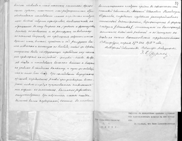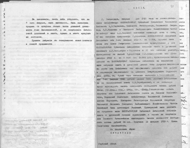 Надо сказать, что этому предшествовала длительная переписка между Е.Г. и Дмитрием Фомичем о том, в каком формате должна происходить передача архива, в ней чувствуется даже некоторое раздражение с обеих сторон, что завело переговоры в тупик. Но, благодаря вмешательству министерства, группа специалистов ИПБ выехала на квартиру к Е.Г. и приемка архива была завершена до 12 апреля 1915 года (фото 30). Ни одного листка из перечисленного в Протоколе 1913 года не пропало, об этом есть документ, составленный при передаче архива А.В.Карташовым (фото 27).