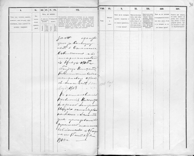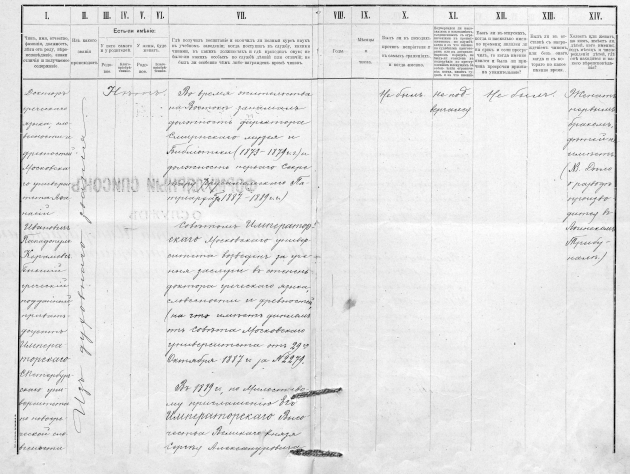 Вторая значительная часть документов - Формулярный список о службе А.И. в ИПБ Санкт-Петербурга. (фото 7-9). В нем послужной список А.И., записи о зачислении на должность библиотекаря, сведения о наградах. Интересен первый разворот формуляра (26 страница дела): в графе «о семейном положении» есть запись о том, что А.И. женат первым браком, детей не имеет, дело о разводе производится в Афинском трибунале.