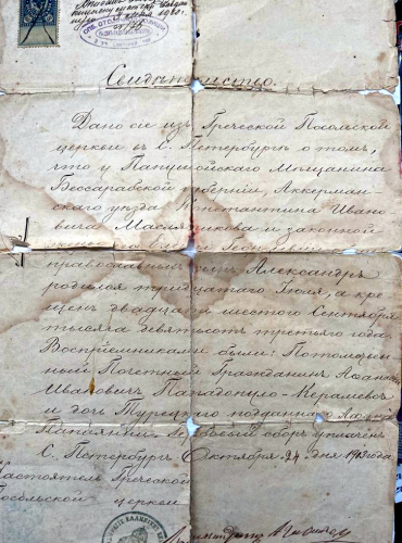 Разбирая архив моей бабушки, Масленниковой Ксении Михайловны (маминой мамы) или бабушки Кисы, как мы все ее называли, я обратила внимание на пожелтевший от времени, вчетверо сложенный большой лист с потрёпанными краями, склеенный с внешней стороны пергаментной бумагой, так как на изгибах листа образовались просветы и дырки. Развернув, прочла: «Свидетельство. Дано сие из Греческой Посольской церкви в Санкт-Петербурге о том, что у Попошуйского мещанина Бессарабской губернии, Аккерманского уезда Константина Ивановича Масляникова и законной жены его Елены Георгиевны сын Александр родился 30 июля, а крещен 26 сентября 1903 года. Восприемниками были: потомственный почетный гражданин Афанасий Иванович Папандопуло-Керамевс и дочь турецкого поданного Афина Папаянни. Гербовый сбор уплачен. С.Петербург Октября, 24 дня, 1903 года. Настоятель Греческой Посольской церкви Архимандрит……….. (фото 1)./3/