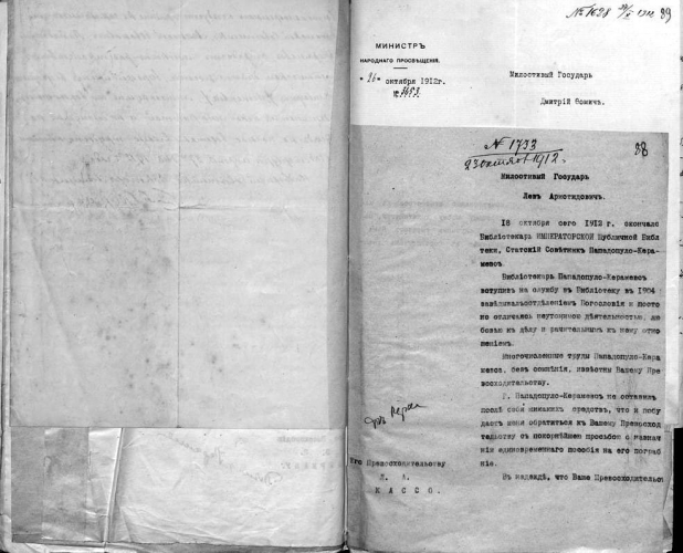 Первая папка (фото 12а) - это «Дело Императорской публичной библиотеки о службе Афанасия Ивановича Пападопуло-Керамевса». В ней переписка управляющего Министерством народного просвещения Российской империи Владимира Гавриловича Глазова с директором Императорской Публичной библиотеки Дмитрием Фомичем Кобеко о предоставлении А.И. должности библиотекаря. О прениях по поводу принятия в штат библиотеки ученого грека, не говорящего по-русски, подробно написано у Х.М.Лопарева и рассказано в докладе Н.Н. Лисового на заседании Научной секции Императорского Православного Палестинского Общества, посвящённом 100-летию со дня кончины учёного, члена ИППО А.И. Пападопуло-Керамевса./7/