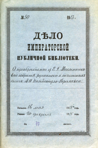 Перед нами лежала еще одна папка, хранящая в себе тайну «погибшего» архива А.И. Надпись на папке была следующая: «Дело Императорской публичной библиотеки. О приобретении у Е.Г.Масленниковой собрания рукописей и печатных книг А.И.Папандопуло-Керамевса. Начало - 16 мая 1913 года. Решено 20 февраля 1915 года, на 47 листах» (фото - 13).