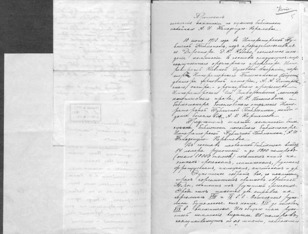 Первые страницы дела рассказывают о создании комиссии по составлению описи архива и библиотеки. В состав комиссии вошли все именитые на тот момент специалисты, хорошо знавшие А.И., его труды, безусловно бывавшие в его доме и знакомые с собранием. Это А.А.Дмитриевский, В.Н.Бенешевич, директор ИПБ Д.Ф.Кобеко, библиотекарь богословского отдела ИПБ А.В.Карташов. В протоколе заседания комиссии приведен подробный перечень всего собрания (фото - 17-17а), который свидетельствует о том огромном значении для исторической науки и византологи, которое имеет сам факт поступления этого собрания в ИПБ. Об этом писал в своей записке директору библиотеки Д.Ф.Кобеко А.А.Дмитриевский: «…будучи знаком с его библиотекой раньше, я всегда признавал приобретение ее для Императорской Публичной библиотеки желательным и почетным…» (фото 6). А вот мнение самого директора ИПБ Д.Ф.Кобеко, которое он высказывает в докладе «господину Главноуправляющему Канцелярии Его Императорского величества»: «К сожалению, русская наука недостаточно знакома с изданиями по византийским древностям, выходившим на греческом языке в пределах Оттоманской империи, откуда они почти не достигали России. Библиотека А.И. Пападопуло-Керамевса, как изложено это в протоколе Комиссии, вмещает в себе именно такового рода книги, могущие служить важным пособием для отечественных византинистов. Составить подобное собрание в настоящее время, по моему убеждению, весьма затруднительно: понадобились бы большие расходы и продолжительное время». (фото - 15-15а).