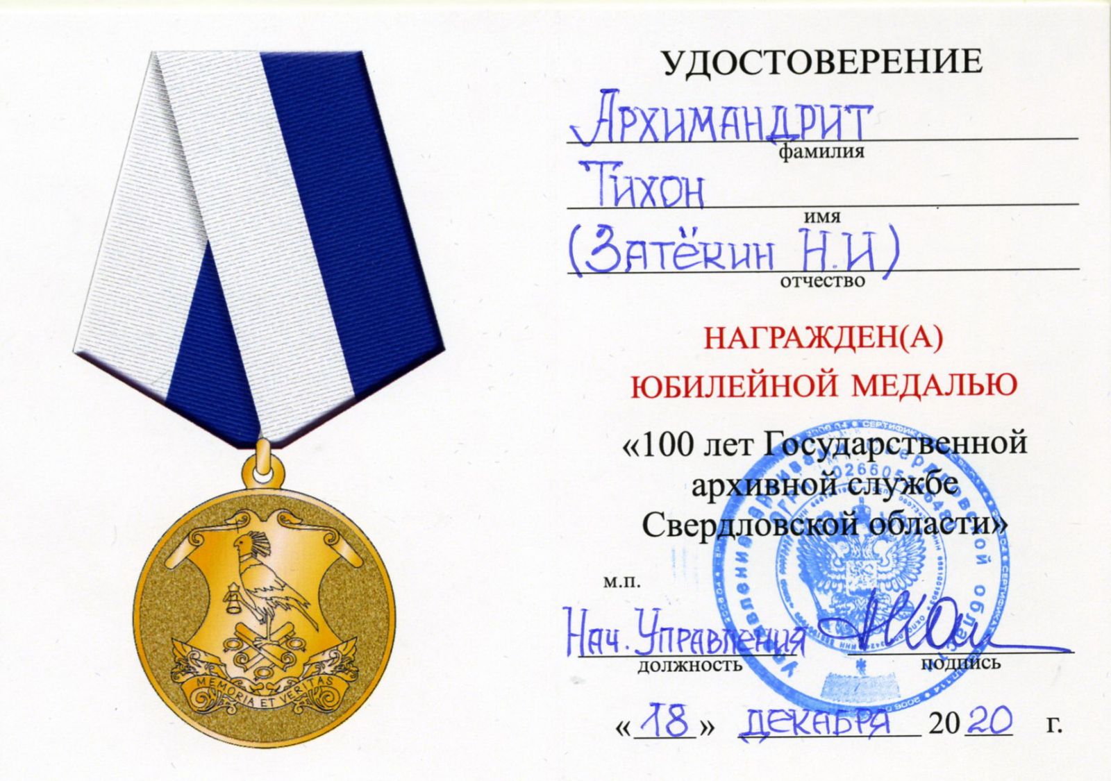 20 декабря 2020 года, после Божественной литургии, начальник Управления архивами Свердловской области Александр Капустин наградил заместителя руководителя Нижегородского отделения ИППО, игумена Нижегородского Вознесенского Печерского монастыря архимандрита Тихона (Затёкина) памятной медалью "100 лет архивной службе Свердловской области".