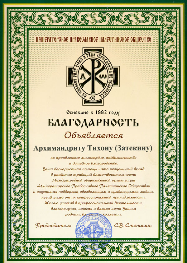 «Благодарность объявляется архимандриту Тихону (Затёкину) за проявленные милосердие, подвижничество и душевное благородство. Ваша бескорыстная помощь – это неоценимый вклад в развитие традиций благотворительности Международной общественной организации «Императорское Православное Палестинское Общество» и ощутимая поддержка обездоленным и нуждающимся людям, независимо от их конфессиональной принадлежности. Желаю успехов в профессиональной деятельности, благополучия, многая и благая лета Вашим родным, близким и коллегам».