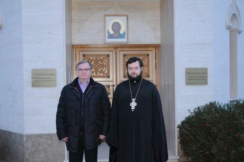У дверей церкви высоких гостей встретил настоятель храма архимандрит Антоний (Севрюк), который рассказал им об истории строительства Екатерининского храма на римской вилле «Абамелек».
