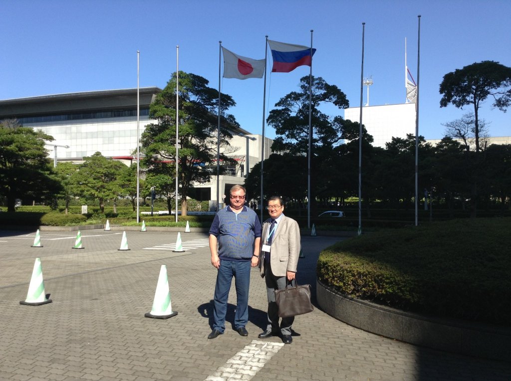 Флаги России и Японии развивались возле отеля "New Otani Maruhari" в честь приезда Сергея Степашина. Рядом с ним - японский ученый-славист, профессор Нобуо Симотомаи, сопредседатель Оргкомитета Конгресса.