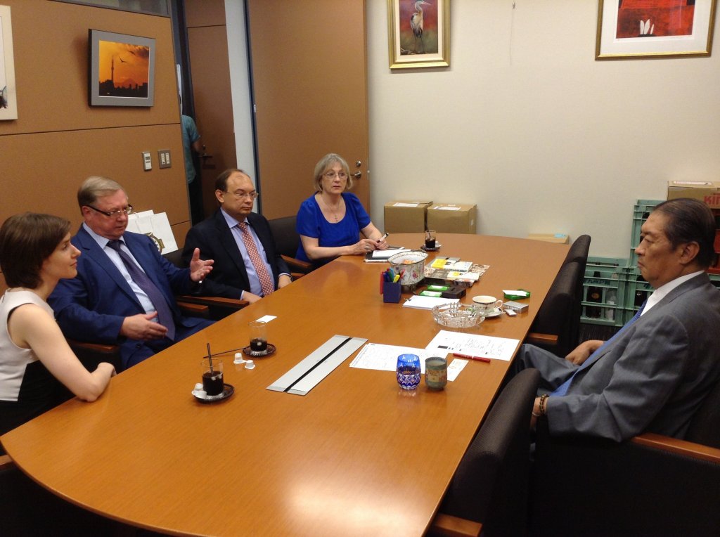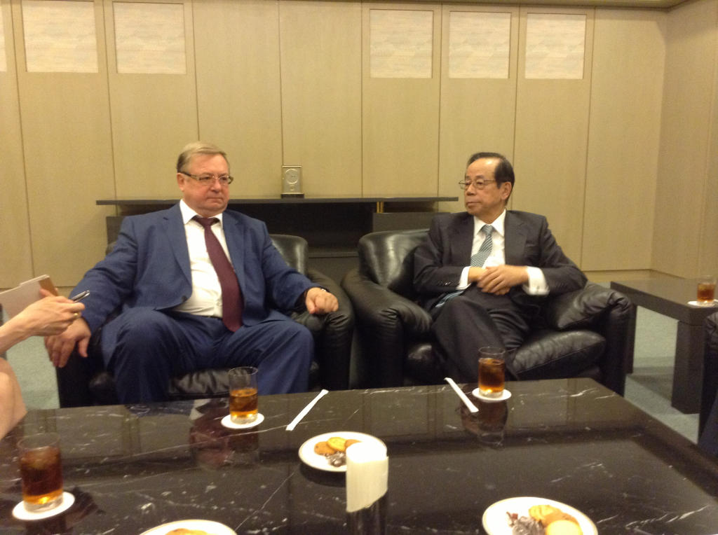 В беседе с Кунио Хатаямой участвовали Временный поверенный в делах России в Японии Дмитрий Биричевский, Елена Агапова и 2-й секретарь Посольства России Татьяна Горохова
