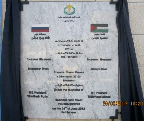 Также хотел бы поблагодарить председателя и членов муниципалитета Вифлеема за их решение назвать одну из улиц Вифлеема улицей Владимира Путина. Это действие отражает всю степень уважения и того, как мы ценим человека, которого зовут Владимир Путин, и как мы ценим российский народ.