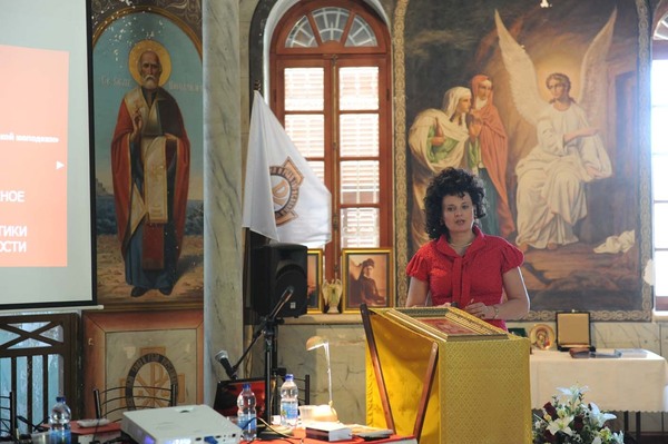 Затем в сопровождении мультимедийной презентации с докладом на тему „Современное православное молодежное движение: ценностные характеристики и технологии деятельности“ выступила Светлана Анатольевна Колобова — секретарь Нижегородского отделения ИППО, кандидат политологических наук. При анализе ценностных ориентаций современной молодежи, в т. ч. верующей ее части, она опиралась на данные опроса, проведенного в 12 регионах России, в 2 из них она лично участвовала, которые наглядно показали всю неоднозначность понимания религиозного мировоззрения в молодежной среде.