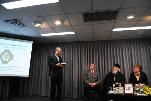 Ведущими круглого стола были профессор Александр Александрович Крюков – директор Российского культурного центра в Тель-Авиве; профессор Алла Кирилловна Конёнкова – ректор ГАСК, кандидат культурологии, профессор, зав. кафедрой искусствоведения, член Императорского Православного Палестинского общества; профессор Михаил Николаевич Громов – первый проректор ГАСК, член Императорского Православного Палестинского общества и архимандрит Иероним (Карпов) – духовник Академии.
