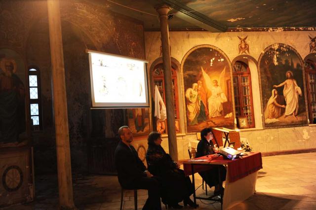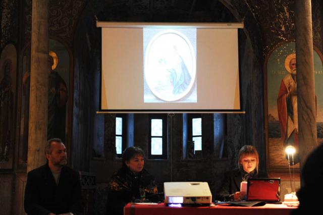 Доклад «Образ Святой Земли в русской эмали второй половины XIX и в начале XX веков» студентки очного отделения факультета изобразительного искусства ГАСК Марии Голдиновой был основан на изучении небольшой коллекции ростовской эмали второй половины XIX века, хранящейся в экспозиции при домовом храме ГАСК во имя преп. Серафима Саровского. Образ Святой Земли в иконе на эмали находит выражение в традиционных ветхозаветных и евангельских сюжетах. Несмотря на различные влияния, которым подвергалась русская финифть, икона на эмали не утратила древней связи с иконописной традицией. Ремесленность исполнения способствовала сохранению не только византийской, но и древнехристианской иконографии. В середине XIX века в Ростове написание финифтевых икон стало народным творчеством.