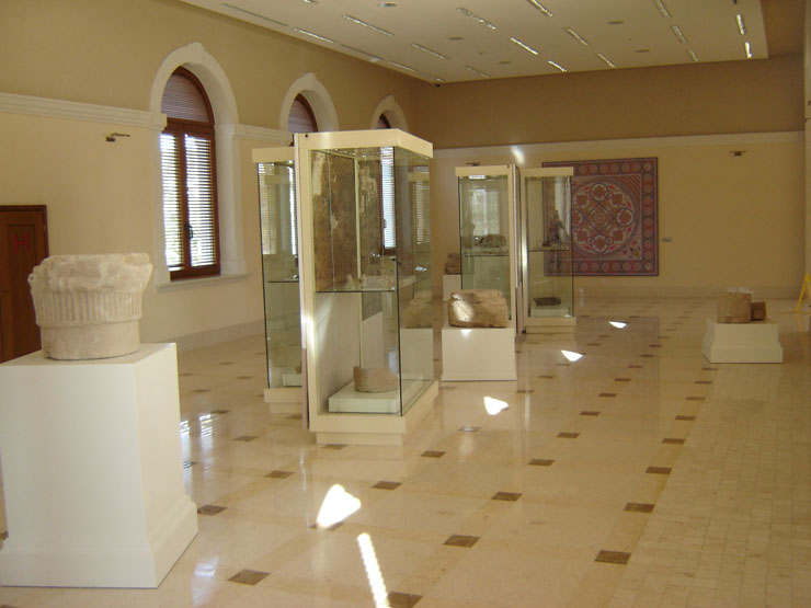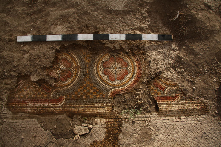 Важная находка – крупная (3.60?3.60 м) мозаика в центре одного из парадных помещений, выложенная из 150 тысяч разноцветных кубиков. Ее композицию образуют сложно сплетенные круги, плетеный орнамент, имитации цветного мрамора и мотивы растений, ассоциирующиеся в религиозной символике с пожеланиями благополучия: цветок граната; розетка; произрастающие из амфоры лозы с гроздьями винограда.