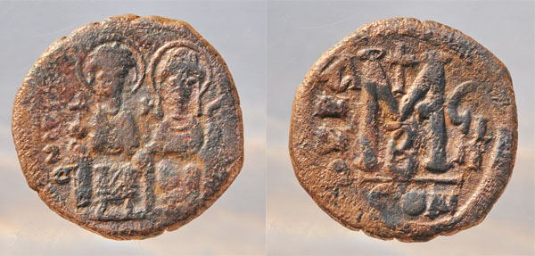 Фоллис императора Юстина II (565-578). Константинополь, дата — 573/574 г.