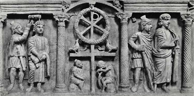 Хризма внутри лаврового венка часто помещалась в центр композиции на раннехристианских саркофагах. На самом известном саркофаге IV–V вв. из Латеранского музея [илл. 10] в центральной части портала вырезан шест, увенчанный венком, внутри которого помещена христограмма. Слева представлена сцена возложения на Христа венка. Христос изображен юношей со свитком в руках, за ним — воин в шлеме и с мечом возлагающий на него венок. Н. В. Покровский обращает особое внимание на эту сцену, считая её единственным примером в раннехристианском искусстве возложения венка на голову Спасителя. «Как форма венка, — пишет Н. В. Покровский, — так и вся сцена производит впечатление не поругания, но прославления Христа; венок не терновый, но лавровый; он есть лишь символ страдания, но не орудие. <…> Венок и птицы могут означать как воскресение Христа (победу над смертью), так и вознесение на небо»[39].