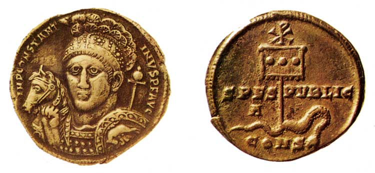 Это замечание особенно важно, так как венок в этой сцене олицетворяет и победу над смертью, и прославление Спасителя, еще более усиливая символику хризмы. Венок, в который заключена монограмма, в римской военной символике обозначал победу, им венчались полководцы и правители. Его часто изображали в руках аллегорической женской крылатой фигуры Победы-Ники (лат. Виктории)[40]. В. Ю. Юрочкин отмечает, что последующие за видением Константина изображения хризмы «следует рассматривать как воспроизведение знака с лабарума св. Константина. Они появляются на монетах Константина, а также других римских императоров… Христограммы помещались на щитах полководцев и императоров еще в эпоху Юстиниана Великого (527–565 гг.), известны они и на его монетах»[41]. «Об изображении победы (Виктории) с крестом на монетах римских императоров с самых древних времен — до Константина, — пишет св. Иоанн Кронштадтский, — равно как и при нём, весьма часто изображалась, между прочим, Виктория в образе крылатой человеческой фигуры. Ее представляли большею частью с лавровым венком в руке, который она или подает изображаемому подле нее императору, или возлагает на его голову, или просто держит его в своей руке, когда изображается одна. Это, очевидно, обычай языческий, который свидетельствовал о вере римских императоров и римского народа в богиню войны. Константин Великий первый дал этой мнимой богине в руки крест, и ее с этого времени последующие римские императоры начали изображать чаще и уже не с лавровым венком, а с истинным знамением победы. Но Константин презирал самую богиню этого имени. На монетах последующих римских императоров, самых многочисленных и разнообразных, видна часто крылатая Виктория с крестом. Крест этот в руках победы, как видно из снимков монет, четвероконечный, — он состоит из длинной трости и небольшого поперечника. Константин первый ввел в обычай на монетах чеканить изображение креста и просто без победы»[42].