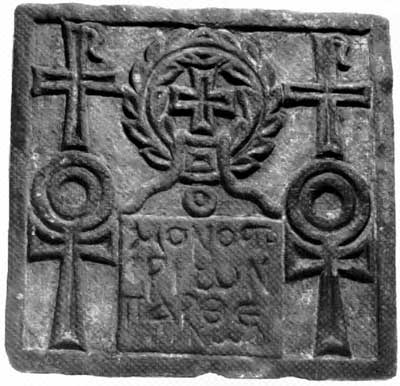 [34]. Опубл. в кн.: Христиане на Востоке: Каталог выставки ГЭ. СПб., 1998. С. 153. Кат. 197. Плита была привезена В. Г. Боком из Египта в 1898 году. 35,5×34,0 см. Известняк, резьба, раскраска. ГЭ № 11085. Плита прямоугольная, украшенная крестами и анхами, имеющая греческую надпись в 3 строки: «Монастырь дев». Вероятно, плита была вмонтирована в стену женского монастыря название которого на ней высечено.