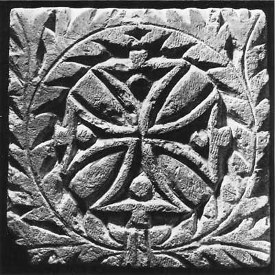 Илл. 9. Рельеф с изображением креста в лавровом венке. VI–VII вв. Египет. Известняк, раскраска. 32 × 32.3 × 7.9 см.