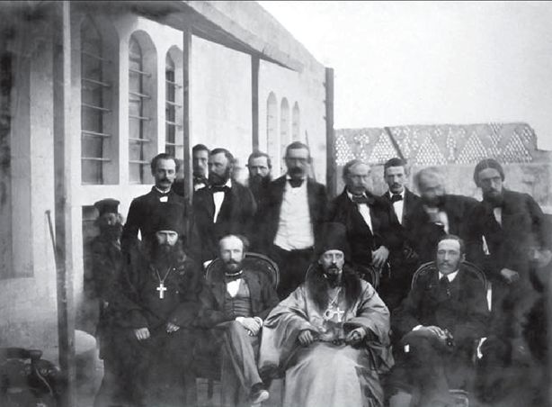 Б.П. Мансуров покинул Одессу не раньше 30 июля. Вместе с ним на пароходе «Ласточка» ехали: директор-распорядитель РОПиТ Н.А. Новосельский; только что назначенный по указу императора на вновь учрежденную должность иерусалимского консула В.И. Доргобужинов; архитектор, занятый на строительстве Морского министерства в Николаеве М.И. Эппингер; дядя Б.П. Мансурова Алексей (Петрович?) Мансуров; некто Хитров; «двое молодых людей г-н Кази[16] и г-н Калоти; и мой постоянный дрогман г-н Вуронклас, очаровательный юноша»[17]. 11 августа они были уже в Константинополе, затем, посетив Афон, Смирну и Бейрут, прибыли в Палестину. Нет сомнения, что почти все спутники Мансурова (за исключением Н.А. Новосельского) запечатлены на снимке строителей Русских подворий. В Иерусалиме Мансуров впервые познакомился с епископом Кириллом (Наумовым). «Епископ Кирилл мне очень понравился, мы очень тепло встретились, и я надеюсь, что все пойдет хорошо», — написал он отцу через два дня после приезда в Святой Град[18].