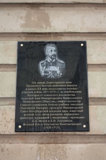 Памятная мемориальная доска, посвященная Великому Князю Константину Константиновичу, была установлена на здании Орловского Бахтина кадетского корпуса.