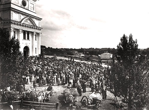 Со всех сторон раскинувшегося по холмам и точно лентой опоясанного рекою города потянулись к Вознесенской церкви, стоящей среди обширной площади и только через реку от соборов, кресты, иконы и хоругви от монастырей и приходских церквей города.