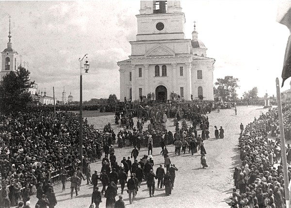 Одним из самых торжественных и величавых моментов этого вечера была всенародная лития, совершенная около помоста, где совершал бдение епископ Гермоген. Сюда явились из Воскресенского и Успенского соборов две торжественные процессии с великой княгиней Елизаветой Федоровной и архипастырями, многочисленным духовенством и певчими, окруженные целым лесом хоругвей. Присутствие великой княгини вселяло в присутствующих необыкновенные радость и благоговение: „На разукрашенном гирляндами зелени балконе стояла ярко освещаемая лучами солнца, вся в белом Великая Княгиня“[5].