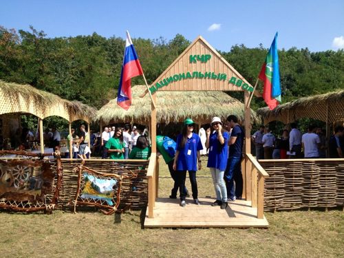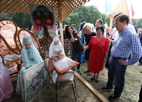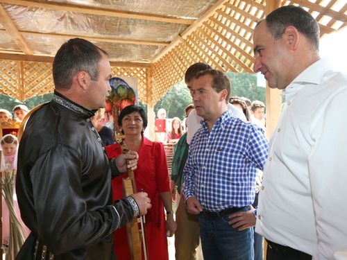 Дмитрий Медведев посетил национальный двор КЧР, где ознакомился с традициями и культурой народов, проживающих в республике. В сопровождении Заместителя Председателя Правительства России — полномочного представителя Президента России в СКФО Александра Хлопонина, Вице-премьера Ольги Голодец и Главы региона Рашида Темрезова он познакомился со старинными национальными промыслами и кухней.