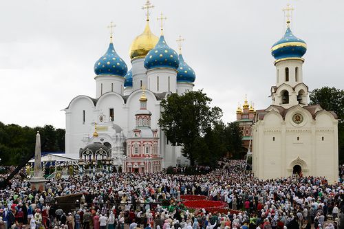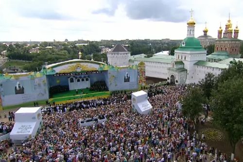 Собравшихся на площади паломников и гостей праздника приветствовали прибывший в Сергиев Посад Президент Российской Федерации В.В. Путин и Святейший Патриарх Московский и всея Руси Кирилл. Затем Святейший Патриарх и В.В. Путин посетили Успенский и Троицкий соборы Троице-Сергиевой лавры, где поклонились честным мощам преподобного Сергия.