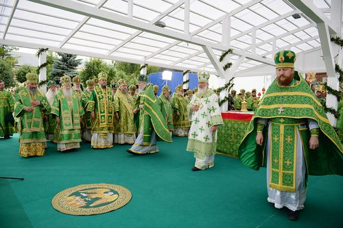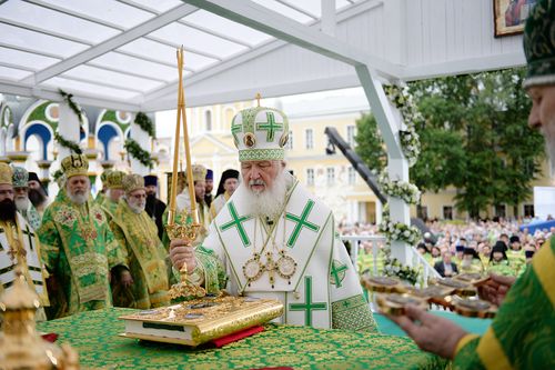 Святейший Патриарх Московский и всея Руси Кирилл, председатель Комитета почетных членов Императорского Православного Палестинского Общества, возглавил служение праздничной Литургии на Соборной площади обители. Богослужение совершалось перед престолом, установленном на помосте с сенью у врат Успенского собора.