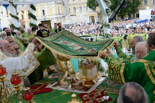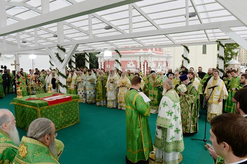 Как сообщает пресс-служба Патриарха Московского и всея Руси, Его Святейшеству сослужил собор архиереев и духовенства Русской Православной Церкви, в том числе постоянные члены Священного Синода — митрополит Черновицкий и Буковинский Онуфрий, Местоблюститель Киевской митрополичьей кафедры; митрополит Крутицкий и Коломенский Ювеналий - почетный член Императорского Православного Палестинского Общества; митрополит Кишиневский и всея Молдовы Владимир; митрополит Астанайский и Казахстанский Александр, глава Митрополичьего округа Русской Православной Церкви в Республике Казахстан; митрополит Ташкентский и Узбекистанский Викентий, глава Среднеазиатского митрополичьего округа; митрополит Санкт-Петербургский и Ладожский Варсонофий, управляющий делами Московской Патриархии; митрополит Минский и Слуцкий Павел, Патриарший экзарх всея Беларуси; митрополит Волоколамский Иларион, председатель Отдела внешних церковных связей, почетный член Императорского Православного Палестинского Общества; а также митрополит Ростовский и Новочеркасский Меркурий, председатель Организационного комитета Русской Православной Церкви по проведению празднования 700-летия со дня рождения преподобного Сергия Радонежского.