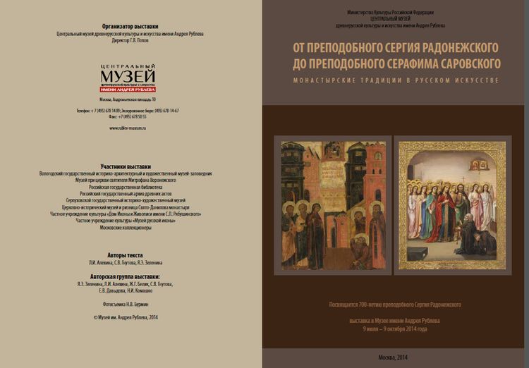 Как пишет в буклете директор Музея профессор Г.В. Попов, "настоящая выставка стала для Музея имени Андрея Рублева второй в череде торжественных мероприятий, посвященных 700-летию преподобного Сергия Радонежского. Первая выставка - «Преподобный Сергий Радонежский и образ Святой Троицы в древнерусском искусстве» - была открыта 10 декабря прошлого 2013 года и закрылась 10 февраля. Из самого ее наименования следует, что основное внимание на ней было сосредоточено на иконах преподобного и разнообразных вариантах воспроизведения неразрывно связанного с ним сюжета Святой Троицы в ХV - начале ХVIII столетия.
