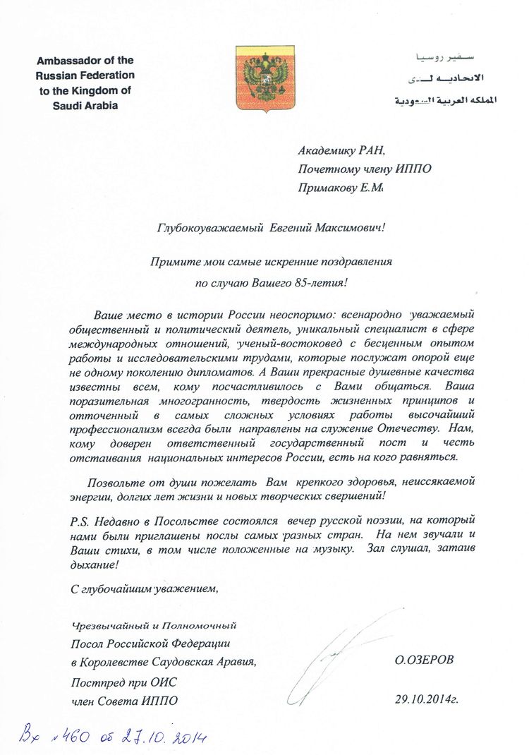 Свое поздравление юбиляру направил также член Совета ИППО Чрезвычайный и Полномочный Посол России в Саудовской Аравии Олег Борисович Озеров.