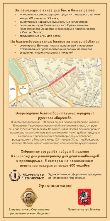 13-30 21-00 Посреди улицы стоят в ряд 12 деревянных палаток в стиле шале. Здесь продаются сувениры от Елисаветинских монастырей и известных отечественных производителей народных промыслов, а также угощения лучших московских пекарней. На всех ярмарочных палатках висят гербы Елисаветинского базара, рождественские пожелания.