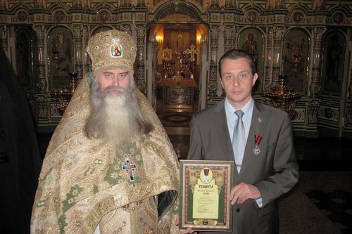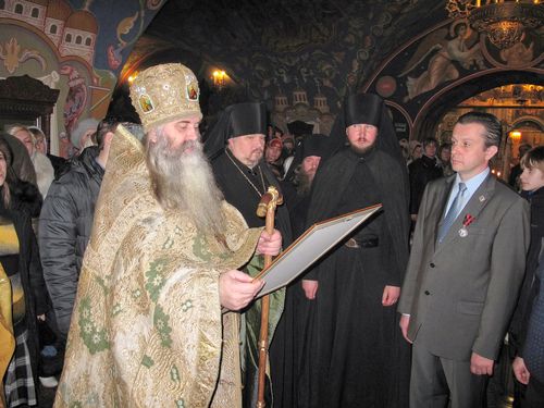 Архимандрит Тихон вручил почетную грамоту Семену Яковлевичу Ваксману «За активное сотрудничество с Нижегородским Вознесенским Печерским мужским монастырем, совместное участие в издательских, выставочных, патриотических и просветительских проектах, за личный вклад в пополнение фондов Церковно-археологического музея Нижегородской епархии, а также за участие в деле передачи на вечное хранение в Вознесенскую Печерскую обитель величайшей святыни – части древа Закхея».