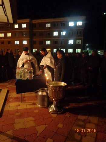 Перед проведением Таинства благочинный Южного Карачаево-Черкесского церковного округа протоиерей Евгений Субтельный и помощник командира бригады иерей Иоанн Афонин совершили чин великого освящения воды перед храмом святого Благоверного Князя Дмитрия Донского.