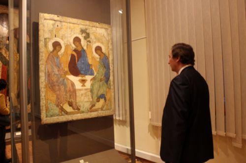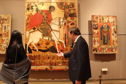 Обстоятельный и заинтересованный разговор со студентами получился у икон преподобного Андрея Рублёва – Святая Троица, Спас из Деисусного чина, а также у икон Чудо святого Георгия, святой Иоанн Предтеча в житии, Спас Нерукотворный (Симона Ушакова) и других.