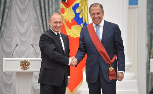 Здесь большую роль, безусловно, играет наша дипломатия – Министерство иностранных дел. Сергей Викторович Лавров и его коллеги с профессионализмом, достоинством отстаивают интересы страны, последовательно и эффективно проводят её внешнеполитический курс. Сегодня Сергею Викторовичу вручается орден «За заслуги перед Отечеством» I степени".