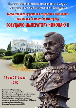 - Митрополит Симферопольский и Крымский Лазарь одобрил установку в Ливадии памятника императору Николаю II под эгидой ИППО