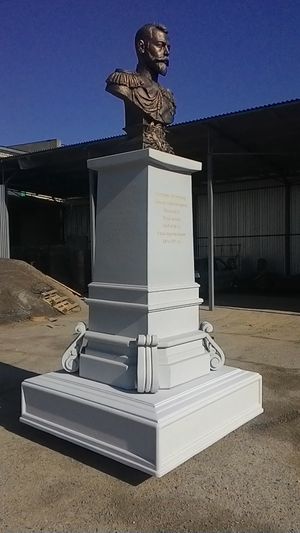 Бюст Государю Императору, постамент и поддон для постамента изготовлены из мрамора. Высота поддона - 40 см., подиума - 1 м. 90 см., бюста Государя Императора - 1 м. Общий вес – 4 тонны 300 кг. Бюст Государю Императору выкрашен под цвет бронзы.
