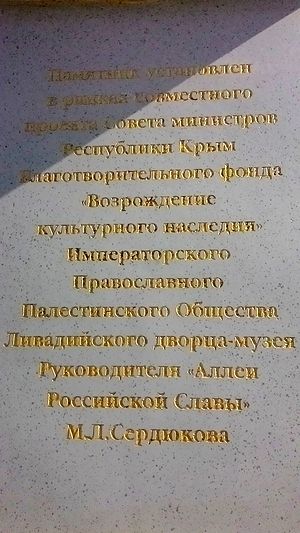 5 мая 2015 года в Ливадийский дворцово-парковый музей-заповедник, расположенный в городе Ялте, доставлен памятник почетному члену Императорского Православного Палестинского Общества святому страстотерпцу Государю Императору Николаю II.