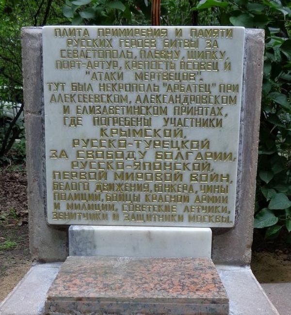 В субботу, 1 августа, в 12.30 в Москве на месте снесенного воинского некрополя «Арбатец» (сквер на ул. Алабяна) откроют плиту «Примирения и Памяти русских Героев» в честь Героев битвы за Севастополь, Плевну, Шипку, Порт-Артур, крепость Осовец и «Атаки мертвецов».