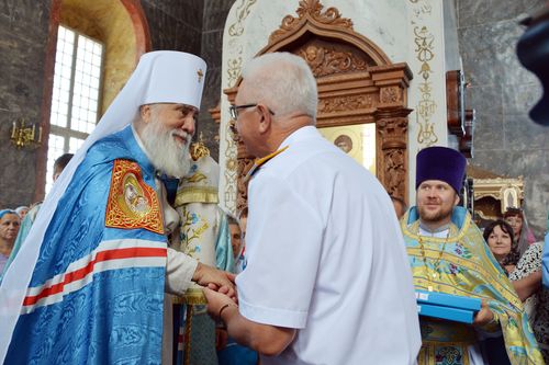 С престольным праздником и юбилейной датой в истории собора митрополита Астраханского и Камызякского Иону и всех участников торжества поздравили настоятель собора иерей Дионисий Фокин и вице-губернатор - председатель правительства Астраханской области К.А. Маркелов.