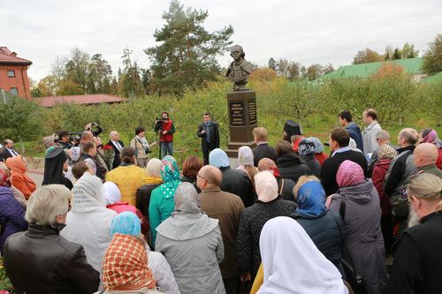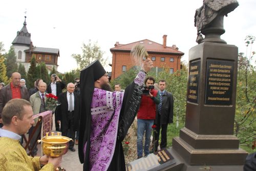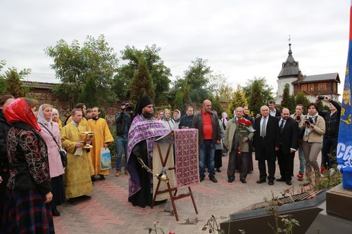 Право торжественно снять покрывало с памятника было предоставлено Александру Николаевичу Панину и Семену Яковлевичу Ваксману. После снятия покрывала игумен Евмений совершил освящение памятника, окропив его святой водой. К подножию памятника было возложено несколько букетов цветов.