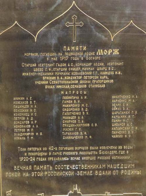 Еще одним местом, где нашли последнее пристанище русские воины, стала затонувшая у берегов Турции торпедная подлодка «Морж». Эти герои легли в чужой земле, защищая собственное Отечество и уже в другой войне. Ориентировочно подлодка затонула в период с 12 по 15 мая 1917 года со всем экипажем из 42 человек на позиции у берегов Турции в районе Эрегли. В 1918 году германская сторона передала спасательный круг с надписью «Моржъ».