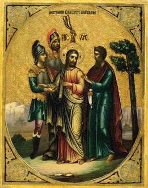 Называется икона "Лобзание Иисуса Христа Иудою". Когда ее отец Евмений дарил, то сказал: "Многие люди меня спрашивают, что я должен Иуду целовать на иконе? Эта икона была обретена в нашем монастыре в 1829 году, когда только недавно был усмирен бунт 1825 года, известный как восстание декабристов. Они ставили своей целью разрушить устои государства, убить Царя и повести Россию по западным путям развития. Но Господь и железная воля Императора Николая I этого не допустили. Когда икона явилась, то монахи и старцы обители однозначно ответили, что так Господь показывает нам маловерным, что если мы не станем следовать Его спасительным заповедям, будем искать лжеучений, то все повторится, мы своим поведением греховным будем каждый раз удалятся все далее и далее от Христа. А потому этот образ есть всем нам напоминание, что никогда не поздно оставить свои грехи и встать на путь следования за Спасителем".